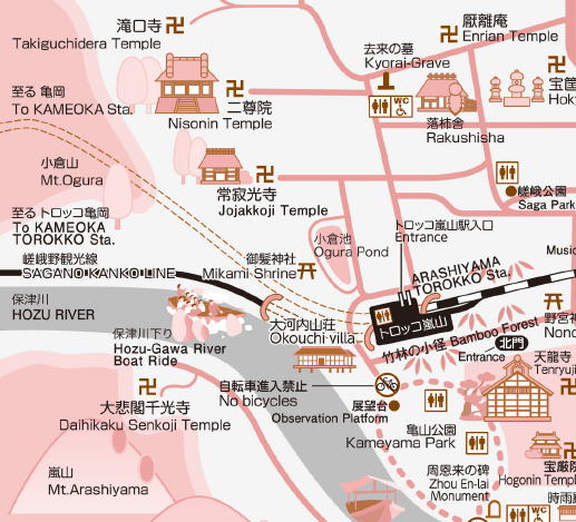 ●小倉山は、大堰川(保津川)を挟んで嵐山の北に位置する標高280mの低い山です。この辺りは、平安時代から貴族のレジャーの場所として人気がありました。多くの貴族や歌人が、平安京から千代の古道といれた山越街道、広沢の池を経て嵯峨を訪れていました。 |