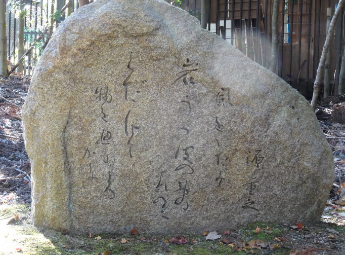 ●小倉百人一首の編纂の舞台となった嵐山・嵯峨野では、100基の歌碑めぐりを楽しめます。「風をいたみ」の歌碑は、常寂光寺と二尊院の間の長神の杜公園にあります。 |